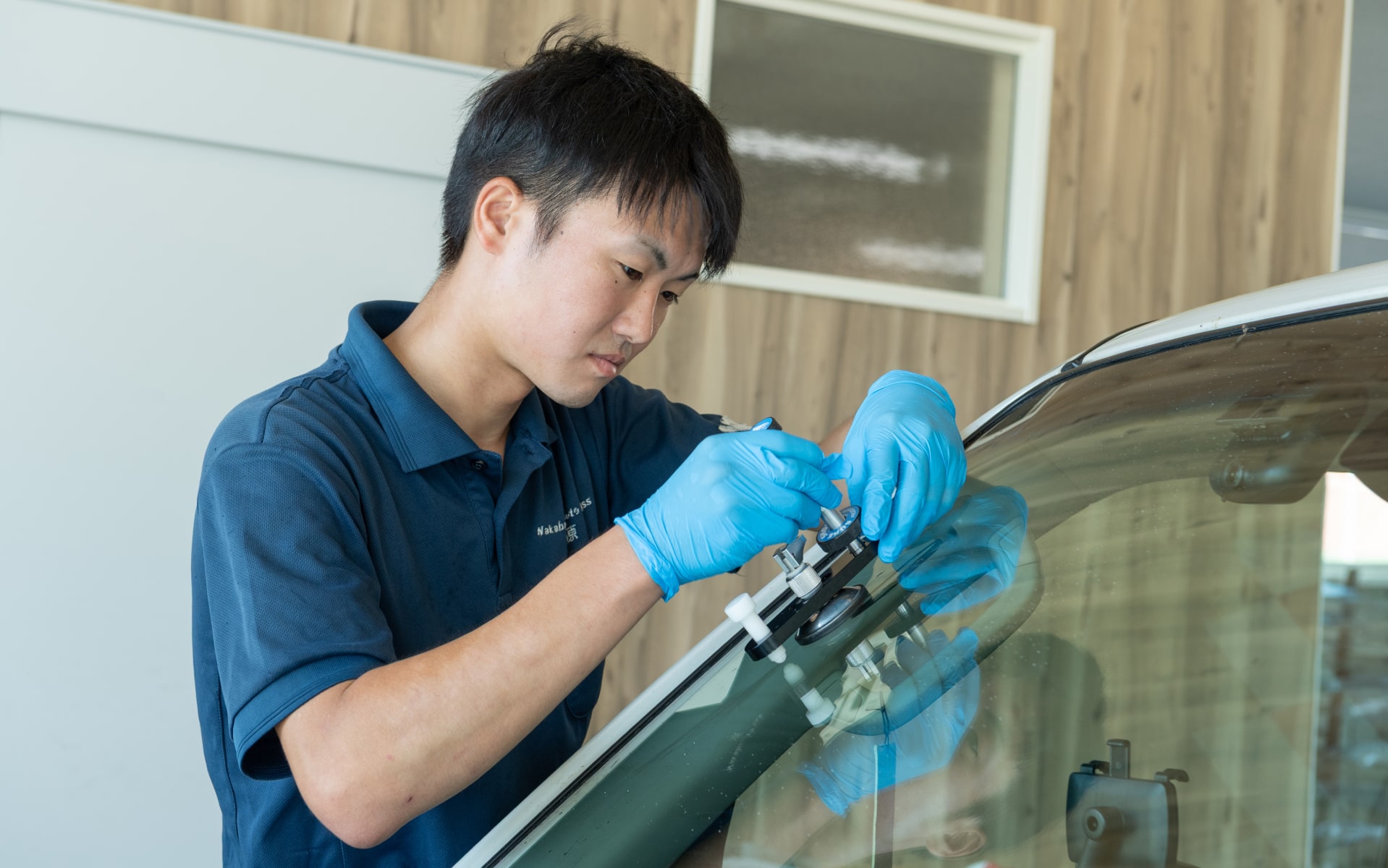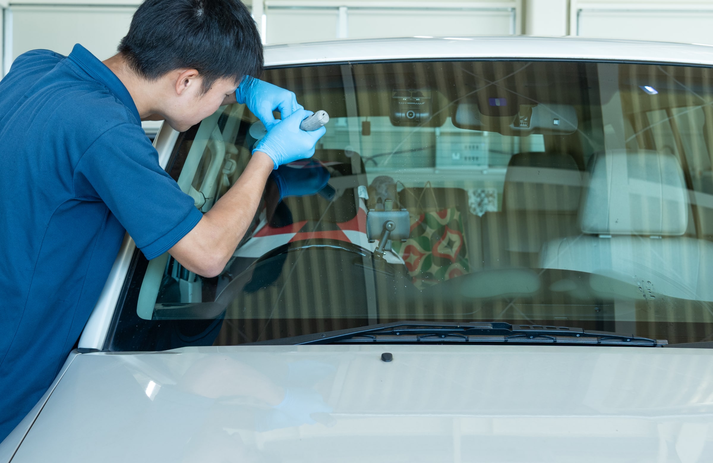飛び石などで傷付いたガラスの修理には、ひび割れの中に入ってしまった空気を抜き、レジンを入れる作業を行います。
